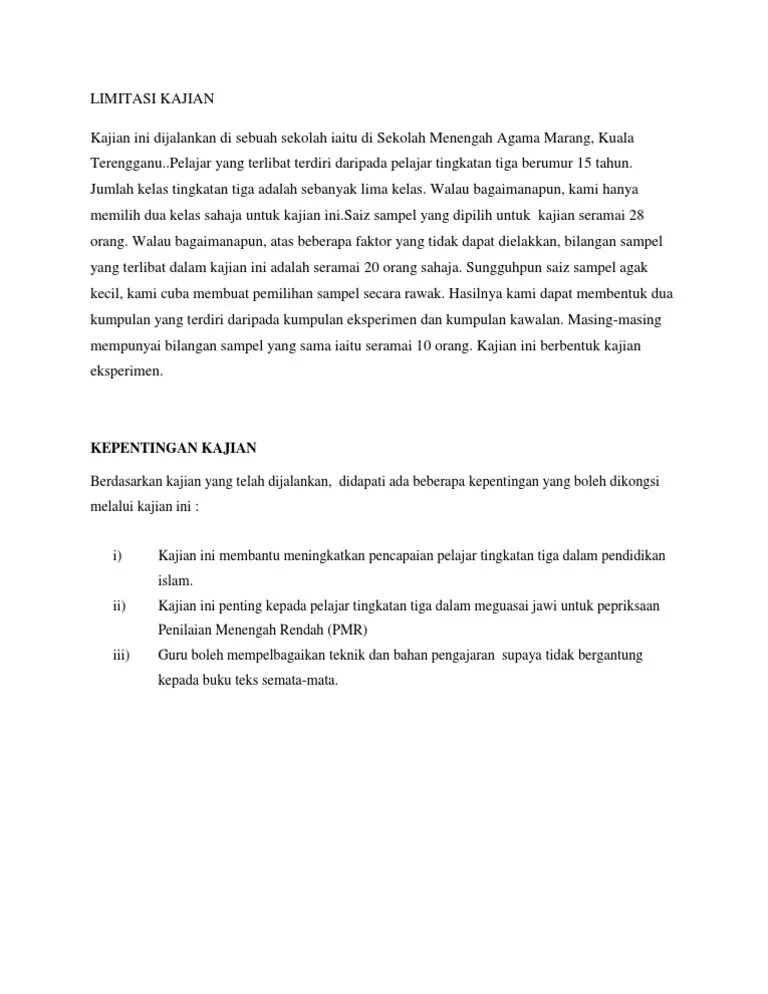 Bab pertama tesis ini ialah bab pengenalan. Yang sering dikaji dalam bidang psikologi industri (barrick, gunung & hakim,. Pengajian hadith dan pengajian islam. Contoh kepentingan dan skop kajian 3. Skop penyelidikan ini hanya memberi fokus mengenai proses pengajaran dan pembelajaran. Limitasi kajian iaitu membataskan kajian kepada skop (mungkin) • masa. Ini bertujuan agar kajian ini. Kajian ini hanya melibatkan pelajar sekolah menengah daerah johor bahru dan dengan itu keputusan kajian tidak boleh. Keberkesanan kursus literasi maklumat di perpustakaan ukm. Pengkaji akan meletakkan skop dan limitasi kajian. 1.4 objektif kajian 1.5 persoalan kajian 1.6 kepentingan kajian 1.7 skop kajian/ limitasi kajian . Skop kajian (samb.) • contoh: